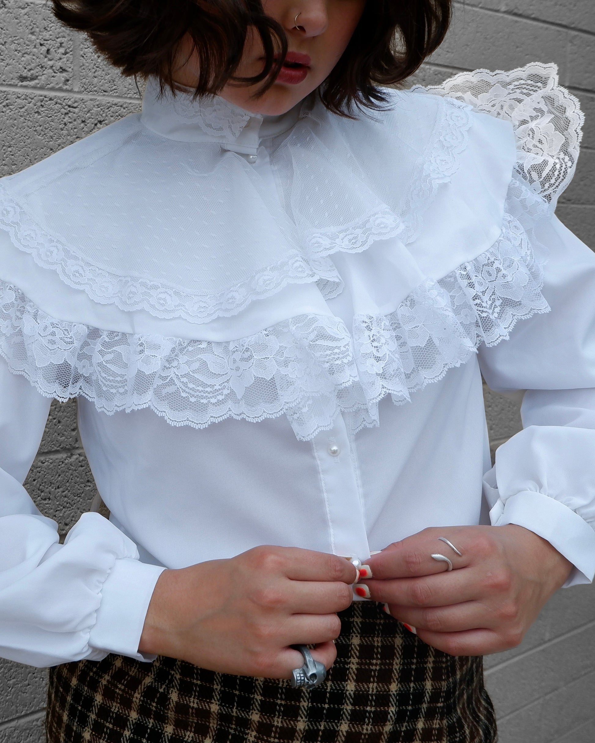 This vintage piece features a wide lace collar and streaming ribbons, perfect for rodeo riding or a stylish day out. The crisp white fabric is surprisingly pristine for its age, making it a standout item.